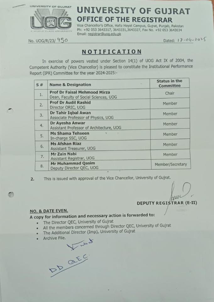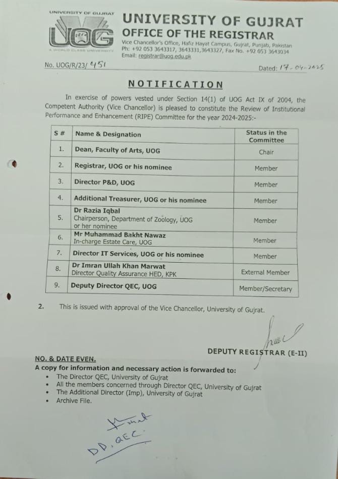 The Review of Institutional Performance and Enhancement (RIPE) 2024-2025 was conducted in University of Gujrat on 26 June 2025 onward. Mr.Ijaz Ahmed Director QEC GC,Women University Sialkot was visited as an External member of RIPE Committee.